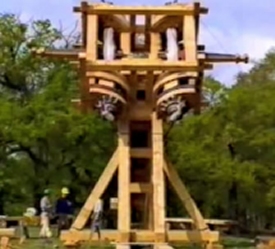 The catapult was recreated by a team of experts, following all known records, as accurately as possible – and then successfully fired. It was created for the BBC in 2002 for a programme called Building the Impossible. It was built by(and is now being sold by) the timber-frame team at Carpenter Oak & Woodland.